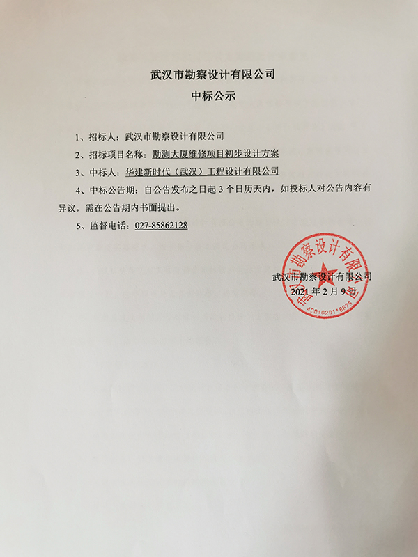 武漢市勘察設(shè)計有限公司勘測大廈維修項目初步設(shè)計方案中標結(jié)果公示