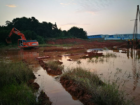自設(shè)備進(jìn)場,9月下旬至10月上旬,咸寧市又遭遇了連續(xù)降雨天氣,場地濕滑,地表滿布淤泥,施工條件極差,進(jìn)駐現(xiàn)場后,現(xiàn)場負(fù)責(zé)人及時調(diào)配三組水泵、挖機(jī)等場地整理設(shè)備,對現(xiàn)場的泥水,淤泥進(jìn)行全面的清理整平工作,以保證鉆探施工正常作業(yè)。但連續(xù)陰雨天氣的影響,導(dǎo)致場地不斷積存大量泥水,而武漢市勘察設(shè)計有限公司承擔(dān)的咸寧高新區(qū)(甘魯片區(qū))棚改項目施工勘察項目的外業(yè)鉆探還在堅持作業(yè)。項目現(xiàn)場負(fù)責(zé)人同鉆機(jī)班組一道攻堅克難、櫛風(fēng)沐雨,在泥水中作業(yè),雨鞋、衣服滿是泥漬。