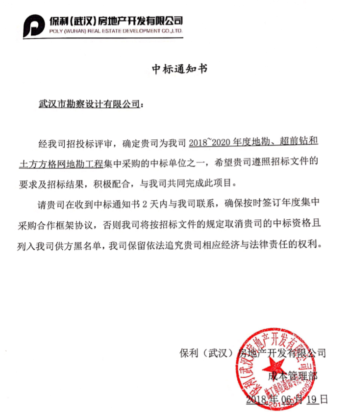 經(jīng)招投標(biāo)評(píng)審,我司被確定為保利(武漢)房地產(chǎn)開(kāi)發(fā)有限公司2018-2020年度地勘、超前鉆和土方方格網(wǎng)地勘工程集中采購(gòu)項(xiàng)目的中標(biāo)單位之一。本次項(xiàng)目的中標(biāo)是我司與保利地產(chǎn)武漢公司的又一次密切合作。