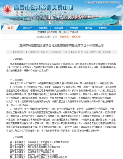 2018年7月13日,我公司以優良的信譽、合適的報價,從14家勘察單位中脫穎而出,成功入選宜昌市城建基礎設施項目地質勘察服務商備選庫,本次服務商備選庫擇優選取前七名候選人,服務期三年。招標人為宜昌市住房和城鄉建設委員會。服務工作范圍主要為宜昌市城建基礎設施項目5萬元(含5萬元)以上至100萬元(不含100萬元)以下,房屋建筑工程及市政工程提供工程地質勘察及后續服務。
